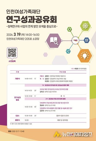 인천여성가족재단은 오는 3월 19일 2층 소강당에서 연구성과공유회를 개최한다.