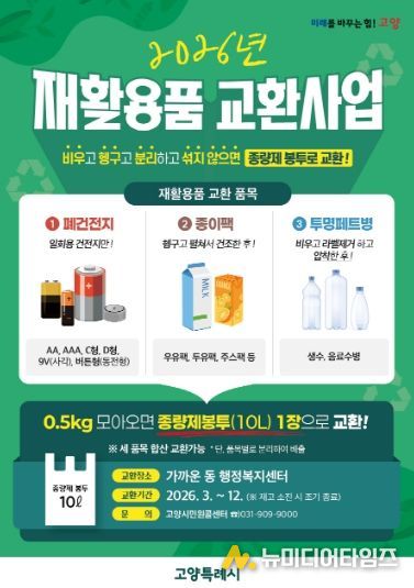 고양특례시 덕양구 창릉동은 주민들의 자원 재활용 참여를 확대하고 올바른 분리배출 문화를 정착시키기 위해 ‘2026년 재활용품 교환사업’을 운영한다고 밝혔다.