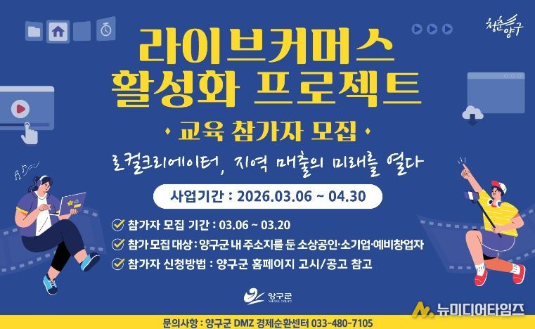 양구군은 지역 소상공인과 소기업, 예비창업자의 온라인 판매 역량 강화를 위해 ‘라이브커머스 활성화 프로젝트 교육’ 참가자를 모집한다.