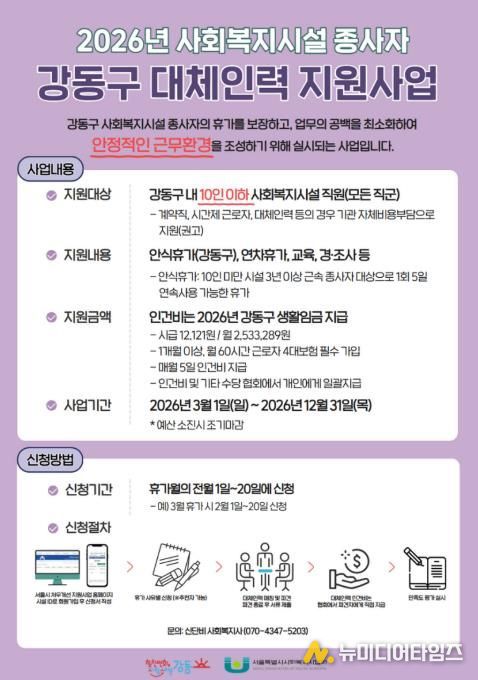 서울 강동구는 소규모 사회복지시설의 업무 공백을 줄이고 종사자의 휴식권을 보장하기 위해 ‘사회복지시설 종사자 대체인력 지원사업’을 추진한다고 밝혔다.