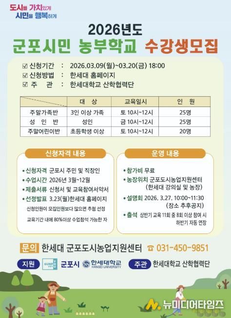 군포시 도시농업 활성화 지원사업 보조사업자인 한세대학교가 오는 3월 20일까지 2026년도 군포시민 농부학교 신규 수강생을 모집한다고 밝혔다.