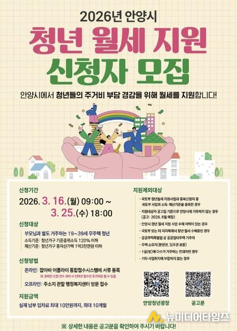 시 관계자는 “이번 사업 개편은 단순히 지원 인원을 늘리는 것에 그치지 않고, 실제 지역 실정과 청년들의 경제적 현실을 반영해 적정한 지원이 이루어지도록 문턱을 낮추는 데 집중했다”며 “더 많은 청년이 주거 걱정 없이 안양에 머물며 미래를 설계할 수 있도록 하겠다”고 전했다.