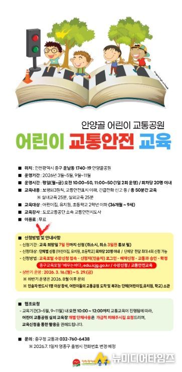 인천시 중구는 ‘2026년도 상반기 안양골 어린이 교통공원 어린이 교통안전 교육’을 추진한다고 12일 밝혔다.