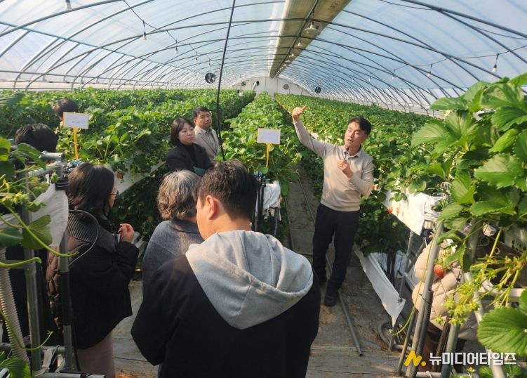 이어 논산시 부적면 소재 딸기 재배농가를 방문해 LED 보광등과 다단재배 시설이 적용된 재배 현장을 직접 견학했다.