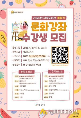대전 동구는 ‘2026년 자양도서관 봄학기 문화강좌’를 운영하며, 이달 16일부터 동구 공공도서관 누리집을 통해 수강생을 선착순 모집한다고 밝혔다.