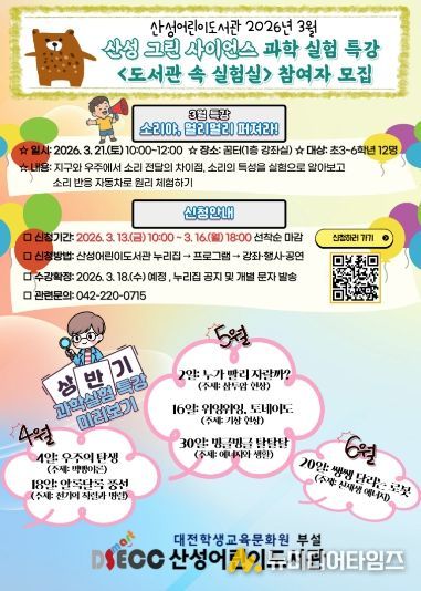 대전학생교육문화원 부설 산성어린이도서관은 유·초등학생의 미래 역량 향상을 위한 ‘산성 그린 사이언스’ 상반기 프로그램을 3월부터 운영한다고 밝혔다.