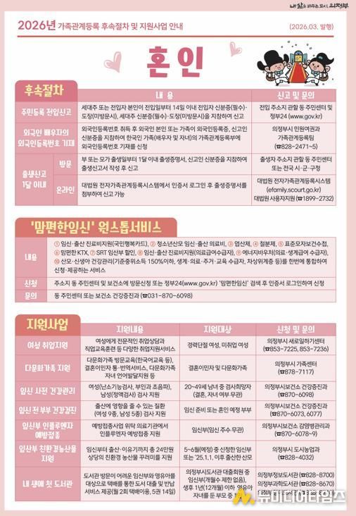 의정부시는 3월 12일부터 ‘가족관계등록 신고 후속절차 및 지원사업 안내문’을 시청 민원실과 각 동 행정복지센터를 통해 시민들에게 제공한다.