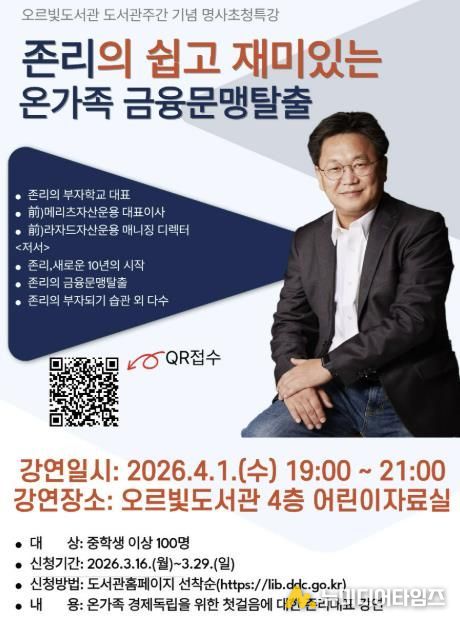 동두천시 도서문화사업소는 오는 4월 1일 오후 7시, 오르빛도서관 4층 어린이자료실에서 도서관 주간을 기념해 ‘존리의 쉽고 재미있는 온 가족 경제 강연’을 개최한다고 밝혔다. 이번 특강은 시민들의 금융 이해도를 높이고, 자녀와 부모가 함께 올바른 경제관념을 세울 수 있도록 돕기 위해 기획됐다.