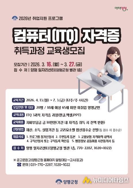 양평군은 오는 16일부터 디지털 기반 업무 환경에 대응할 수 있는 실무형 인재 양성과 지역 일자리 창출을 위해 2026년 취업지원 프로그램 ‘컴퓨터(ITQ) 자격증 취득과정’ 교육생을 모집한다.