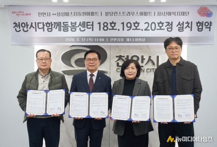 천안시는 12일 시청 제1소회의실에서 성성비스타동원·불당린스트라우스 아파트 입주자대표회의, 사회복지법인 신아복지재단과 ‘다함께돌봄센터 18·19·20호점 설치장소 제공’을 위한 협약을 각각 체결했다.
