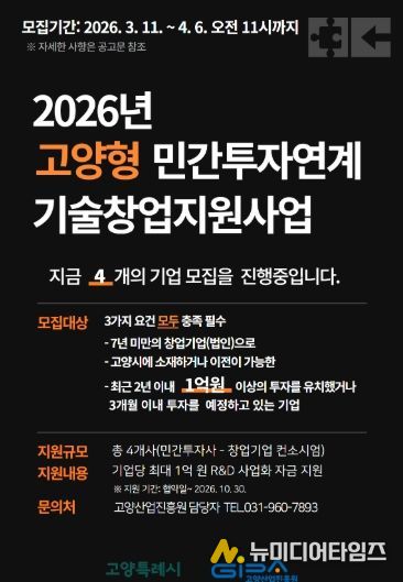고양산업진흥원이 유망 기술창업기업의 투자 유치와 기술 고도화를 지원하기 위한 ‘2026년 고양형 민간투자연계 기술창업지원사업’에 참여할 창업기업을 모집한다.