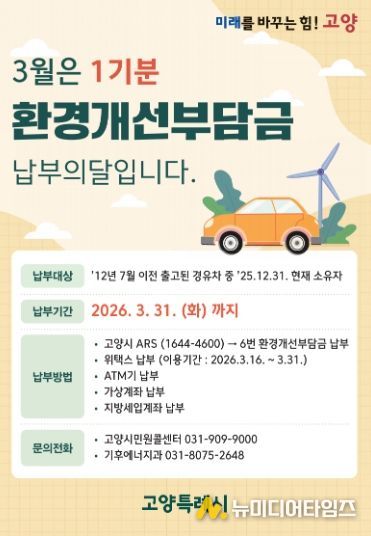 고양특례시는 노후 경유 차량 소유자를 대상으로 2026년 상반기 정기분 환경개선부담금을 부과한다고 12일 밝혔다.