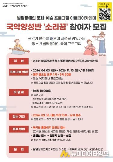 고양시장애인종합복지관은 청소년 발달장애인을 대상으로 국악기 연주를 배우고 실력을 키울 수 있는 국악 프로그램 국악양성반 ‘소리꿈’ 참여자를 모집한다.