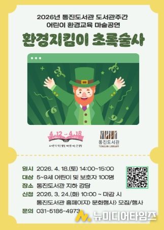 ‘환경지킴이 초록술사’ 공연은 4월 18일 오후 2시부터 3시까지 통진도서관 지하 강당에서 진행된다. 대상은 5~9세 어린이 및 보호자 100명이다. 참여를 원할 경우 3월 24일 오전 10시부터 통진도서관 누리집에서 신청하면 된다.