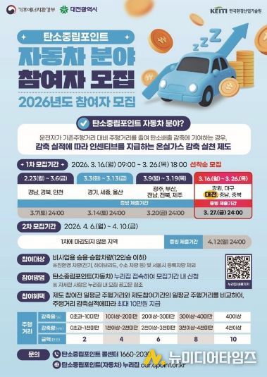 대전시는 자동차 주행거리 감축 실적에 따라 인센티브를 지급하는 ‘2026년 탄소중립포인트 자동차 분야’참여자 6,112명을 선착순으로 모집한다.
