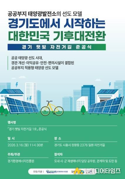 경기 햇빛 자전거길은 경기환경에너지진흥원이 경기도 공공기관 책임계약사업의 하나로 경기교통공사, 경기도주식회사, 경기주택도시공사(GH) 등 3개 공공기관이 함께 협력해 추진했다. 준공식에는 경기환경에너지진흥원이 주최·주관하며 도·시군·민간 발전사 관계자 등 약 100명이 참석할 예정이다.