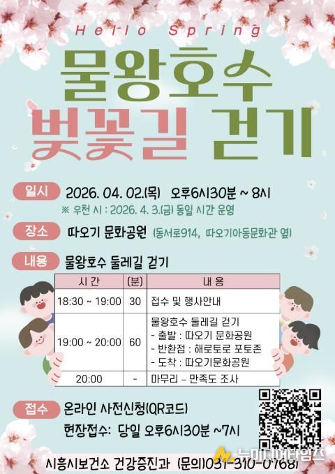 이형정 시흥시보건소장은 “봄철 벚꽃이 만개하는 물왕호수 둘레길을 가족과 이웃과 함께 걸으며 건강한 생활 습관을 실천할 수 있는 뜻깊은 시간이 되길 바란다”라며 “많은 시민의 관심과 참여를 부탁드린다”라고 말했다.