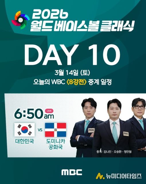 한편, MBC는 내일(14일) 토요일 오전 6시 50분부터 미국 마이애미 론디포파크에서 펼쳐지는 2026 WBC 8강전 대한민국과 도미니카 공화국의 경기를 오승환, 정민철 해설위원과 김나진 캐스터의 진행으로 마이애미 현지에서 생중계한다.