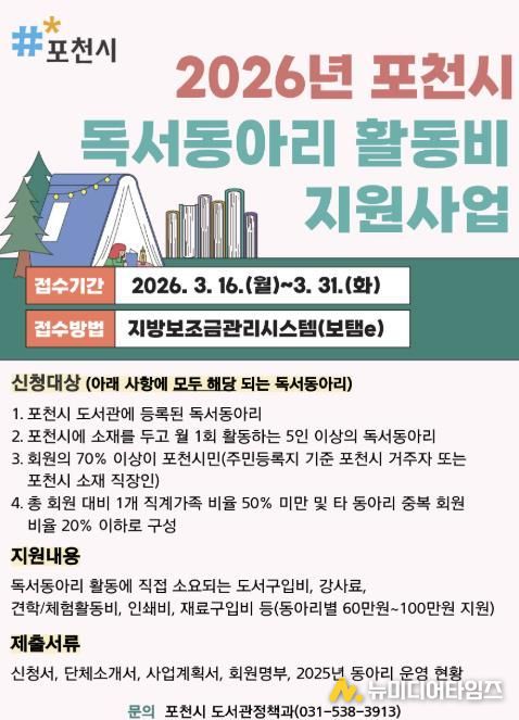 포천시가 시민들의 독서 활동 기회 보장 및 지역내 독서동아리 활성화를 위해 2026년 독서동아리 활동비 지원 사업을 실시한다.