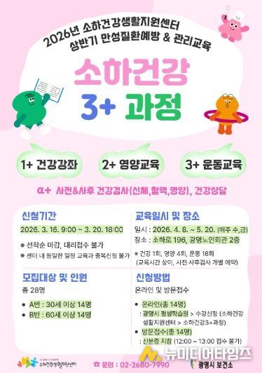 광명시 소하건강생활지원센터가 오는 4월부터 5월까지 운영하는 만성질환 예방관리 교육 프로그램 ‘소하건강 3+과정’에 참여할 시민을 모집한다.