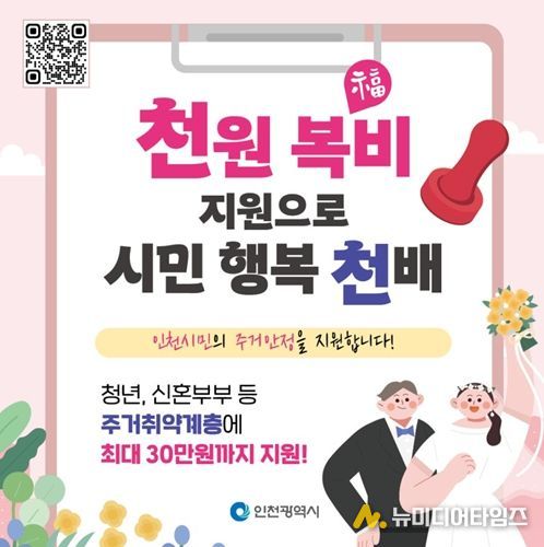 인천광역시는 무주택 청년과 신혼부부 등 주거취약계층의 주거비 부담을 덜어주기 위해 추진 중인‘천원 복비 지원사업’이 시민들의 주거 안정에 실질적인 도움을 주고 있다고 밝혔다.