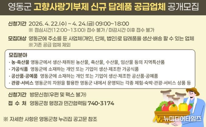 충북 영동군이 2026년도 고향사랑기부제 신규 답례품 공급업체를 모집한다고 8일 밝혔다.