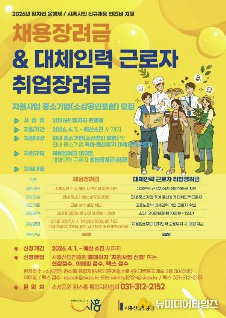 시흥시는 관내 중소기업의 신규 채용을 촉진하고 안정적인 고용 창출을 위해 ‘2026년 일자리 은행제’ 사업 참여자 모집을 4월 1일부터 시작한 가운데 예산 소진 시까지 진행한다.