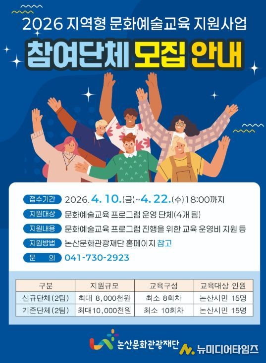 논산문화관광재단은 지역 문화시설과 자원을 활용한 지속가능한 문화예술교육 기반 구축을 위해 ‘2026 지역형 문화예술교육 지원사업’ 운영단체를 공개 모집한다.