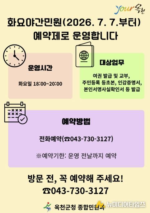 옥천군은 화요야간민원실 운영의 효율성을 높이고 군민의 불필요한 대기와 재방문을 줄이기 위해 오는 7월 7일부터 예약제로 전환해 운영한다고 밝혔다.