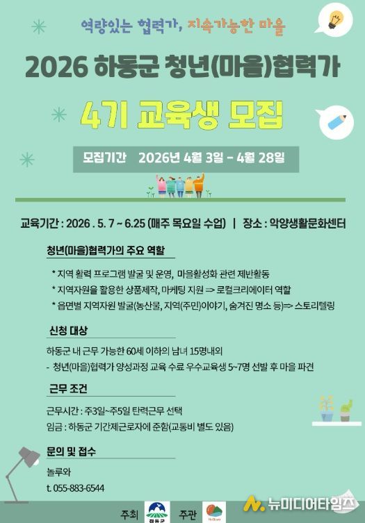 하동군은 지역 활력 회복과 청년 일자리 창출을 위해 추진 중인 ‘청년(마을)협력가 양성과정’의 제4기 교육생을 오는 4월 28일까지 모집한다고 밝혔다.