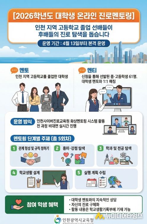 인천광역시교육청은 오는 13일부터, 인천 지역 고등학교 출신 대학생이 중·고등학생의 진로 탐색을 돕는 ‘2026학년도 대학생 온라인 진로멘토링 프로그램’을 운영한다.