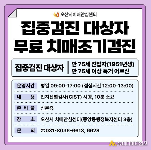 김태숙 오산시보건소장은 “치매는 조기 발견과 꾸준한 관리가 무엇보다 중요한 질환”이라며 “이번 집중검진 대상 어르신들께서는 부담 없이 검진에 참여해 주시길 바란다”고 말했다.
