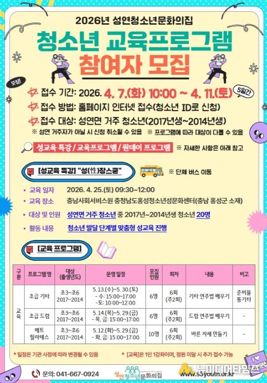 성연면 거주 초등학생(3학년~6학년)이라면 누구나 신청 가능하며, 성연청소년문화의집 홈페이지를 통해 온라인으로 접수할 수 있다.