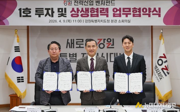 강원특별자치도는 4월 9일, 도청 본관 회의실에서 강원 미래산업을 견인할 [강원 전략 산업 벤처펀드]의 첫 번째 투자기업으로 기능성 바이오 소재 기반 사료첨가제 제조기업인 [밸류라움바이오]를 선정하고 이를 기념하는 [강원 전략산업 벤처펀드 제1호 투자 및 상생협력 협약식]을 개최했다.