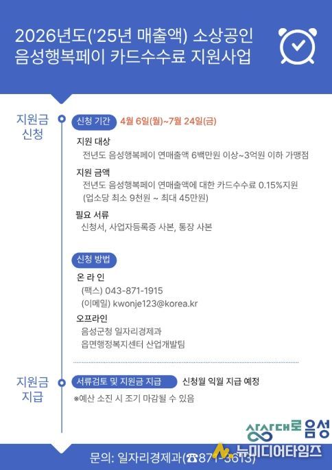 지원 금액은 전년도 음성행복페이 연매출액에 대한 카드수수료 0.15%에 해당하는 금액으로 1개 업체당 최대 45만원까지 지원된다.