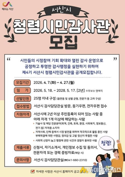충남 서산시가 공정하고 투명한 감사행정 실현과 시민의 시정 참여 기회를 확대하기 위해 제4기 청렴시민감사관을 공개 모집한다고 밝혔다.