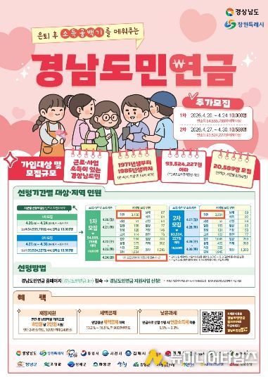 창원특례시는 은퇴 후 국민연금 수령 전까지 소득공백기 대비와 노후준비 지원을 위해 지난 1월 ‘경남도민연금’ 가입자 모집에 이어 4월 추가모집을 시행한다고 밝혔다.