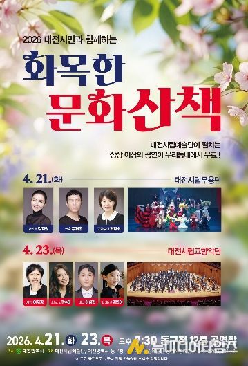 대전시립예술단은 4월 21일과 23일 오후 7시 30분, 동구청 12층 강당에서 봄의 시작과 함께‘2026 화목한 문화산책’의 첫 공연을 선보인다.