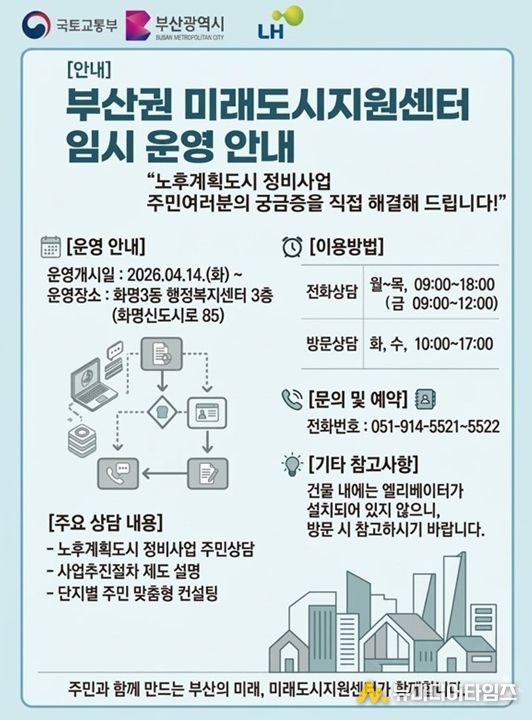 부산시는 노후계획도시 정비사업의 본격화에 대응해, 주민 상담과 맞춤형 컨설팅을 전담하는 비수도권 최초의 '부산권 미래도시지원센터'를 오늘(14일)부터 임시 운영한다고 밝혔다.