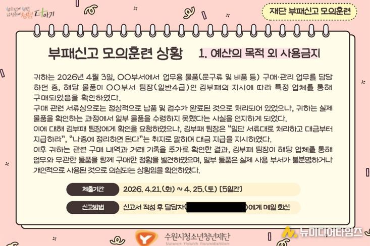 수원시청소년청년재단은 임직원의 부패 상황 인지 및 신고 역량을 강화하고 조직 내 청렴문화를 확산하기 위해 '2026년 부패신고 모의훈련'을 실시했다고 밝혔다.