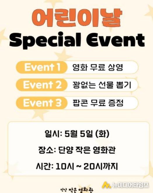 이번 행사는 오는 5월 5일 오전 10시부터 오후 8시까지 운영되며, 무료 영화 상영을 비롯해 ‘꽝 없는 선물 뽑기’와 무료 팝콘 증정 이벤트 등 가족 단위 관람객을 위한 다채로운 프로그램으로 마련된다.