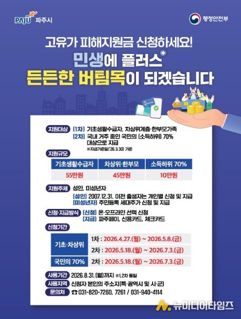 지원 금액은 기초생활수급자 55만 원, 차상위계층·한부모가구 45만 원이며, 신용·체크카드 또는 지역화폐(파주페이)로 지급된다. 이번 지원금의 사용기한은 지급일로부터 2026년 8월 31일까지이며, 기한 내 사용하지 않은 금액은 자동 소멸된다.