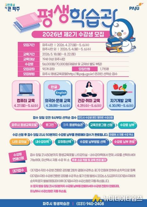파주시 평생학습관은 시민의 평생학습 기회를 확대하기 위해 '2026년 제2기 정규강좌’수강생을 오는 4월 27일부터 5월 6일까지 모집한다.