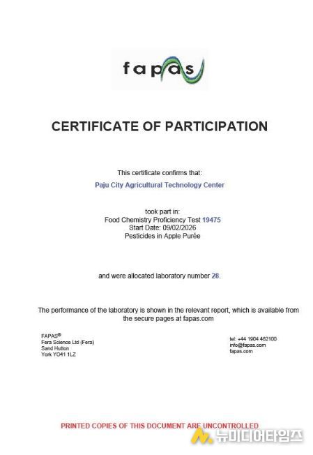 파주시 농산물 안전분석실이 국제적으로 공신력 있는 잔류농약 분석 능력 평가에서 4년 연속 우수한 결과를 달성하며 세계 수준의 분석 역량을 입증했다.