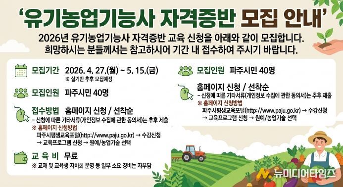 파주시농업기술센터는 친환경농업 분야 농업 전문 인력 육성을 위한 '2026년 유기농업기능사 자격증 취득’교육생을 4월 27일부터 5월 15일까지 모집한다.