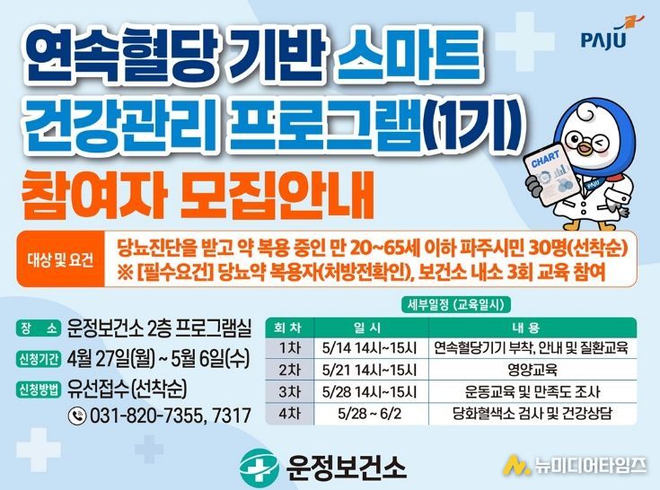 파주시 운정보건소는 심뇌혈관질환 예방관리사업의 일환으로 ‘연속혈당 기반 스마트 건강관리 프로그램’참여자를 오는 27일부터 10일간 모집한다.