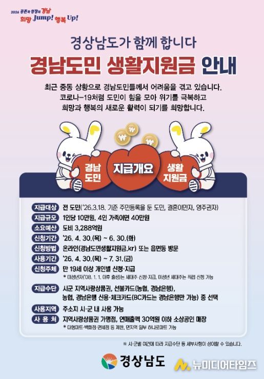 하동군은 군민 생활 안정과 지역경제 활성화를 위해 전 군민을 대상으로 ‘경남도민 생활지원금’을 지급한다고 밝혔다.