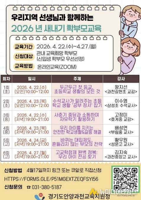 경기도안양과천교육지원청은 오는 4월 22부터 27일까지 관내 신입생 학부모를 대상으로 ‘우리지역 선생님과 함께하는 2026년 새내기 학부모 교육’을 개최한다.