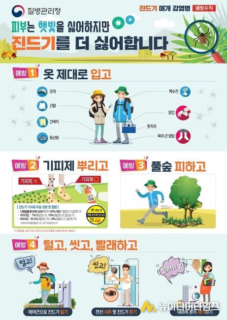의정부시 보건소는 따뜻한 날씨로 농작업, 등산, 캠핑 등 야외활동이 본격화됨에 따라 진드기 매개 감염병 예방수칙 준수를 시민들에게 당부했다.