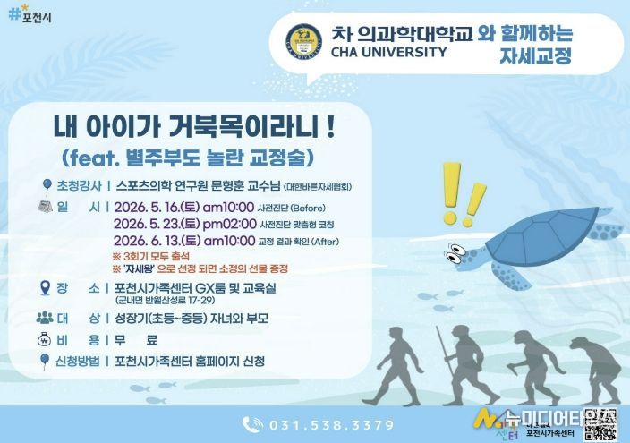 포천시 더 큰 행복 포천시가족센터는 오는 5월 16일부터 6월 13일까지 성장기 자녀를 둔 가족을 대상으로 부모역할지원사업 ‘내 아이가 거북목이라니! feat.별주부도 놀란 교정술’ 프로그램을 운영한다.